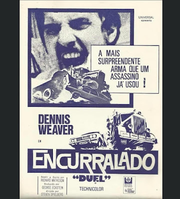 Encurralado (Duel, Estados Unidos, 1971). Universal. Duração: 86 minutos. Direção de Steven Spielberg. Roteiro de Richard Matheson, a partir de sua própria história. Produção de George Eckstein. Fotografia de Jack A. Marta. Música de Billy Goldenberg. Edição de Frank Morriss. Direção de Arte de Robert S. Smith. Elenco: Dennis Weaver (David Mann), Jacqueline Scott (Sra. Mann), Eddie Firestone, Lou Frizzell, Gene Dynarski, Lucille Benson, Tim Herbert, Charles Seel, Shirley O´Hara, Alexander Lockwood, Amy Douglass, Dick Whittington, Carey Loftin, Dale Van Sickel, Shawn Steinman.